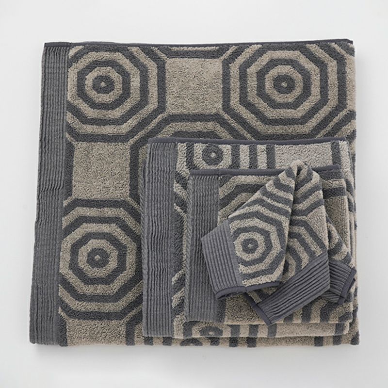 甘撚り糸のロングパイルで、やわらかくボリュームのあるジャガード織り仕上げ。 ヘムのラインに銀糸を使い、シンプルさの中にも高級感をプラスした上品で優雅な雰囲気のタオルです。