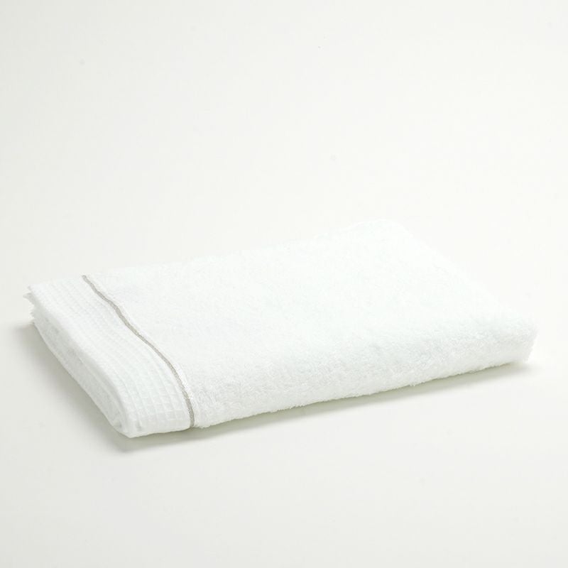 甘撚り糸のロングパイルで、やわらかくボリュームのあるジャガード織り仕上げ。 ヘムのラインに銀糸を使い、シンプルさの中にも高級感をプラスした上品で優雅な雰囲気のタオルです。